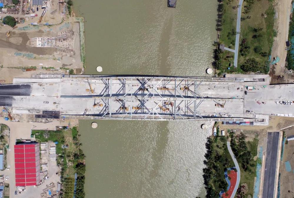 跨京杭運河大橋是萬??焖俾饭こ讨仉y點及控制性節(jié)點工程,施工難度大、精度要求高,決定著整個工程關(guān)門工期。施工過程中涉及的鋼棧橋施工、深基坑施工及上部結(jié)構(gòu)吊裝均為超過一定規(guī)模的危險性較大的分部分項工程,施工安全風險高。為確保按期完成,錢俊多次組織召開專題推進會,倒排工期,掛圖作戰(zhàn),制定詳細的施工計劃,出現(xiàn)偏差及時分析并修正調(diào)整;同時,加強與海事、航道、船閘等部門的對接協(xié)調(diào),確保鋼構(gòu)件及時進場、及時封航吊裝。施工期間,每天安排專人對施工部位進行巡查,檢查措施落實情況,針對發(fā)現(xiàn)的問題及時組織各方商討最佳解決方案,優(yōu)化施工工藝。在全體參建人員的共同努力下,2021年1月27日,跨京杭運河大橋拱肋全部合龍;2021年4月16日,跨京杭運河大橋橋面板合攏......目前,萬福快速路工程正按照既定計劃順利推進,工程形象進度完成率近90%。