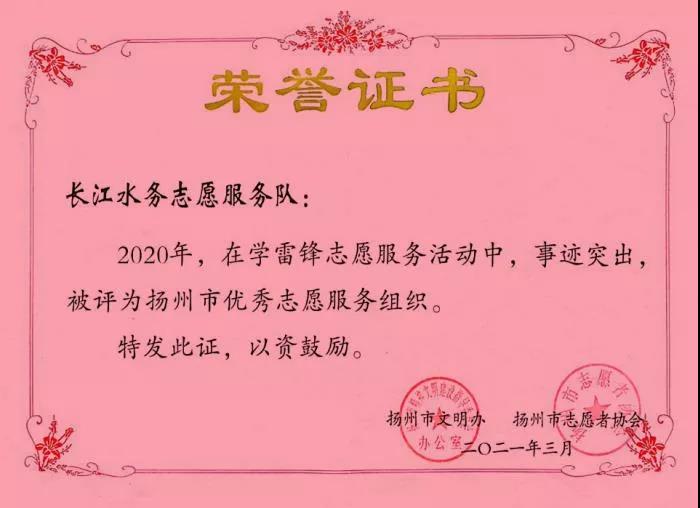 近日,2020年度揚(yáng)州市志愿服務(wù)評優(yōu)創(chuàng)先推薦活動結(jié)果揭曉,長江水務(wù)公司榮獲“揚(yáng)州市優(yōu)秀志愿服務(wù)組織”榮譽(yù)稱號。