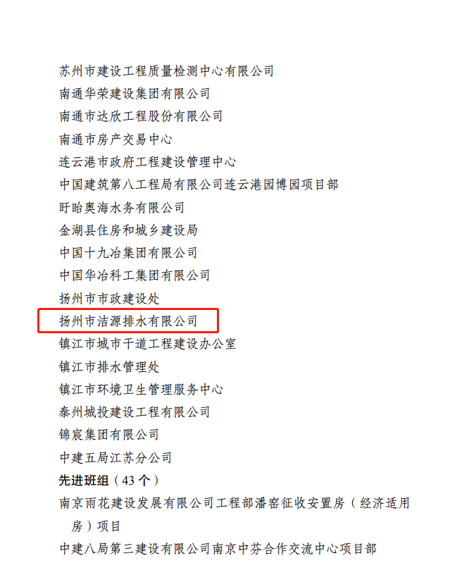12月30日,從江蘇省住房和城鄉(xiāng)建設(shè)系統(tǒng)職工勞動(dòng)競(jìng)賽活動(dòng)領(lǐng)導(dǎo)小組傳來喜訊,揚(yáng)州市潔源排水有限公司被表彰為“2022年度江蘇省住房城鄉(xiāng)建設(shè)系統(tǒng)重點(diǎn)工程和城鄉(xiāng)運(yùn)行保障勞動(dòng)競(jìng)賽先進(jìn)集體”。