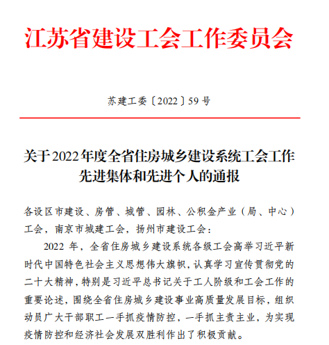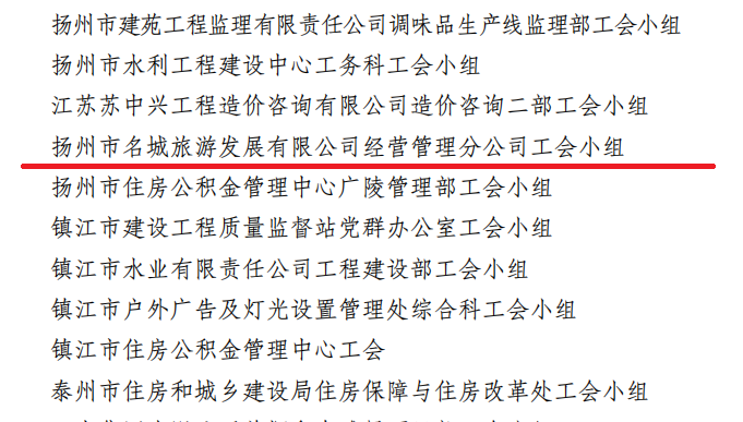 2022年12月30日,江蘇省建設工會工作委員會發(fā)文表彰省住房和城鄉(xiāng)建設系統(tǒng)先進集體,揚州市名城旅游發(fā)展有限公司聯合基層工會經營管理分公司工會小組被表彰為“模范職工小家”稱號。