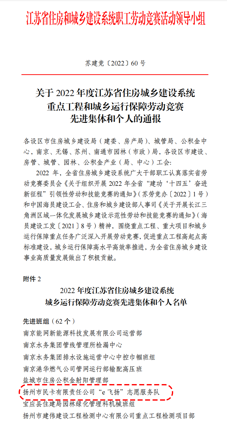 近日,江蘇省住房和城鄉(xiāng)建設(shè)系統(tǒng)職工勞動競賽活動領(lǐng)導(dǎo)小組發(fā)布《關(guān)于2022 年度江蘇省住房城鄉(xiāng)建設(shè)系統(tǒng)重點工程和城鄉(xiāng)運行保障勞動競賽先進(jìn)集體和個人的通報》,市民卡公司“e 飛揚”志愿服務(wù)隊被授予“2022 年度江蘇省住房城鄉(xiāng)建設(shè)系統(tǒng)城鄉(xiāng)運行保障勞動競賽先進(jìn)班組”光榮稱號。
