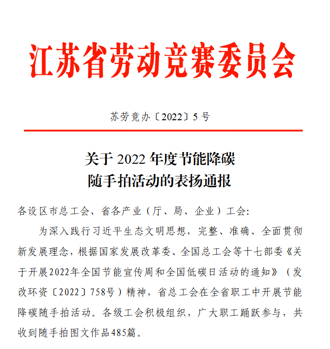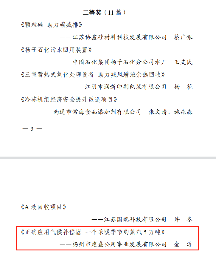 近日,江蘇省勞動(dòng)競賽委員會(huì)發(fā)布《關(guān)于2022年度節(jié)能降碳隨手拍活動(dòng)的表揚(yáng)通報(bào)》,揚(yáng)州市建盛公用事業(yè)發(fā)展有限公司金淳同志的作品——《正確應(yīng)用氣候補(bǔ)償器 一個(gè)采暖季節(jié)約蒸汽5萬噸》榮獲二等獎(jiǎng)。