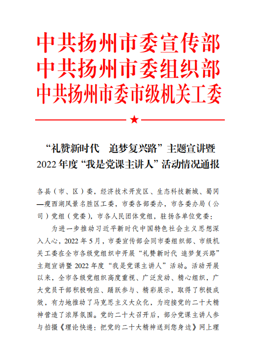 3位黨課主講人均緊扣“禮贊新時(shí)代 追夢復(fù)興路”主題,緊密結(jié)合揚(yáng)州地方實(shí)際和企業(yè)的創(chuàng)新特色發(fā)展,從身邊人身邊事切入,以“小切口”展現(xiàn)“大主題”。