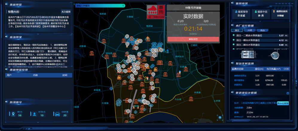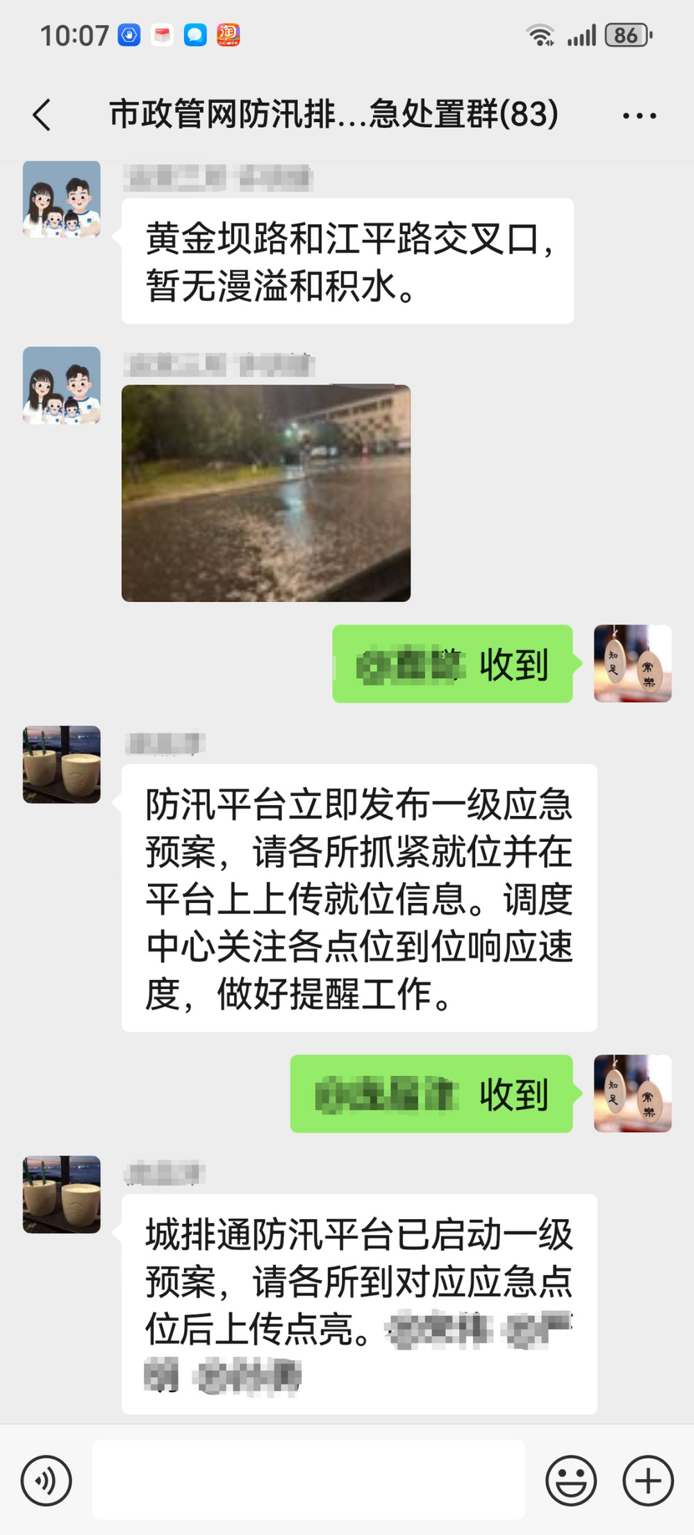 6月6日開始,各相關部門已根據天氣預警按照統一部署和既定安排開展污水設施加密巡查,部署好應急人員、物資隨時待命。6月7日凌晨3時23分氣象部門發(fā)布暴雨藍色預警后,公司立即通過“城排通”系統啟動應急預案,快速落實污水設施、雨水排口、易積水點和在建工程現場的巡查和應急處置工作。由于突降暴雨,市區(qū)部分道路很快出現積水,且涉及多個高考考點周邊,情況十分緊急,與此同時氣象部門緊急升級發(fā)布暴雨黃色預警。為及時做好處置,公司第一時間調整了應急響應等級,通過“城排通”系統實時監(jiān)測運行數據,加強信息共享和部門間應急聯動,適時調整運行調控策略,對發(fā)現的路面積水險情,迅速指揮、調度搶險班組和物資開展應急排澇。