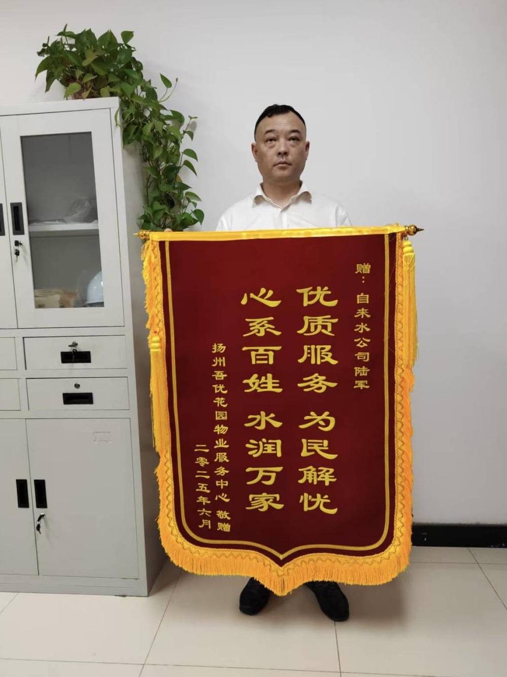 時(shí)隔兩年,物業(yè)公司代表小區(qū)業(yè)主委員會(huì)專(zhuān)程送來(lái)錦旗。錦旗致謝的背后,是對(duì)這位老黨員一直以來(lái)高效處置、貼心服務(wù)的肯定,更彰顯了長(zhǎng)江水務(wù)守護(hù)民生用水的使命擔(dān)當(dāng),為水務(wù)服務(wù)樹(shù)立起暖心標(biāo)桿。