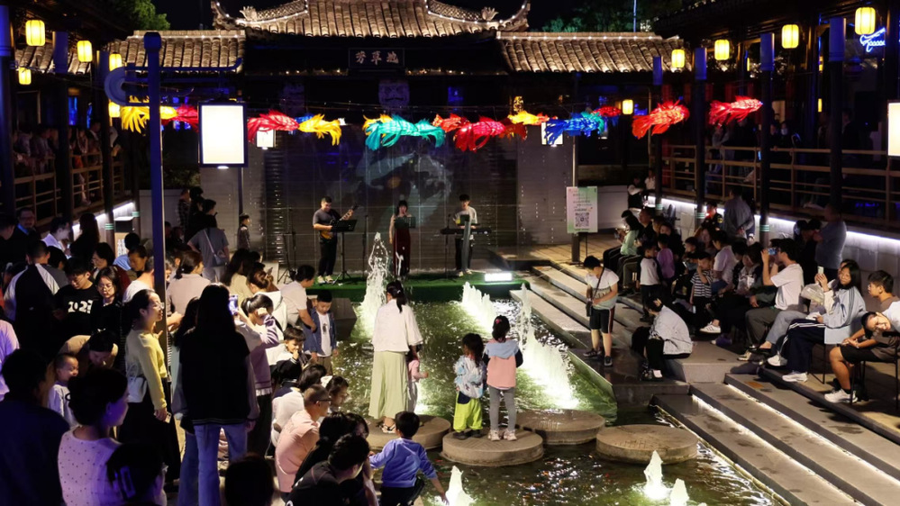 市集之上,音樂聲與歡笑聲交織回蕩。樂隊(duì)的精彩演繹中,動感旋律瞬間點(diǎn)燃觀眾熱情,不少市民、游客主動登臺獻(xiàn)唱,沉浸式享受熱鬧氛圍;古運(yùn)河邊軒窗輕啟,舞者于窗前水袖翻飛,不時(shí)與河邊游客互動,為喧鬧市集注入了鮮活靈動的氣息。
