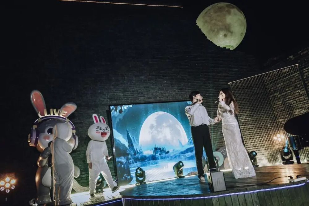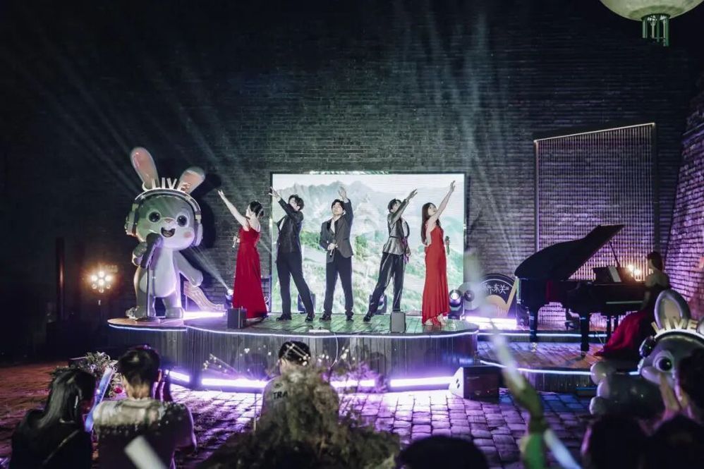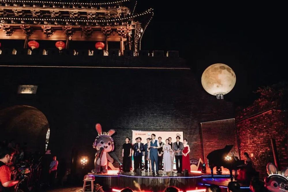傍晚六點(diǎn)半,音樂會(huì)在主持人熱情洋溢的開場中拉開帷幕。在介紹完活動(dòng) “文旅賦能、文化碰撞、空間創(chuàng)新”的核心理念與到場嘉賓后,“紙鳶叩月?啟幕盛典” 儀式成為全場首個(gè)高潮——嘉賓們共同執(zhí)起 “時(shí)光之鑰”,叩響象征古今交融的 “時(shí)光月門”。伴隨主題旋律奏響,系著熒光絲帶的大紙鳶從東關(guān)城樓緩緩升空,嫦娥舞者輕盈起舞,冷焰火瀑布傾瀉而下,光影與音樂交織,瞬間將千年甕城化作連接歷史與當(dāng)下的 “音樂劇場”,正式宣告 “樂下東關(guān)” 微 Live 時(shí)光音樂會(huì)啟航。