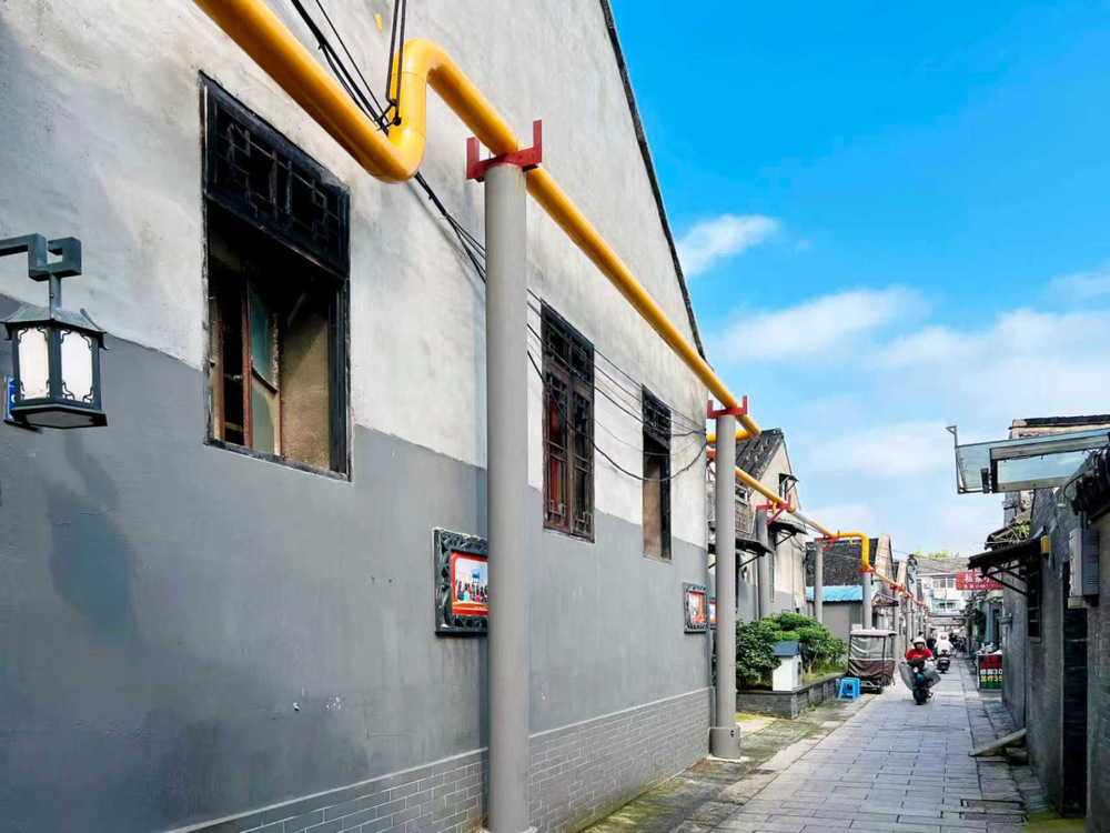 該方案通過精心設(shè)計(jì)與計(jì)算,在無法沿墻敷設(shè)管道的狹窄空間內(nèi),采用設(shè)立專用鋼結(jié)構(gòu)立柱的方式,將燃?xì)夤艿婪€(wěn)固地架設(shè)起來,如同為管道建造了“空中走廊”。這一方法有效規(guī)避了老建筑墻體承重不足、巷道過窄等限制,既保障了管道的安全穩(wěn)固,又最大程度減少了對(duì)原有建筑結(jié)構(gòu)和街巷風(fēng)貌的影響。